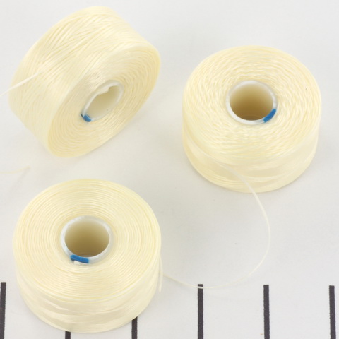 C-Lon AA Thread is perfect for bead weaving projects that call for multiple passes through seed beads and is around 0,09 mm. If your design uses size 15/0 seed beads or small delica beads size 15/0, the size AA thread is the best choice. It will pass several times through these small beads, with tex of 35. There is around 75 yards (68 meter) of thread on a bobbin and a full bobbin is 24 x 12 mm.
