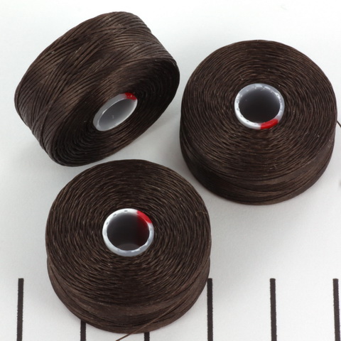 Tex is 45, a full bobbin measures 24 X 12 mm and there is approximately 78 yards (71 meter) per bobbin. This thread will fit through size 15/0 seed beads or larger. C-lon thread is synthetic. This thread is almost identical to Nymo thread size D, which is no longer produced.