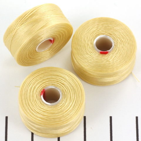 Tex is 45, a full bobbin measures 24 X 12 mm and there is approximately 78 yards (71 meter) per bobbin. This thread will fit through size 15/0 seed beads or larger. C-lon thread is synthetic. This thread is almost identical to Nymo thread size D, which is no longer produced.