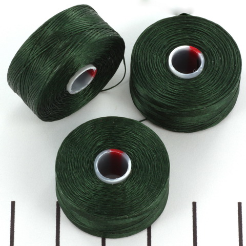 Tex is 45, a full bobbin measures 24 X 12 mm and there is approximately 78 yards (71 meter) per bobbin. This thread will fit through size 15/0 seed beads or larger. C-lon thread is synthetic. This thread is almost identical to Nymo thread size D, which is no longer produced.