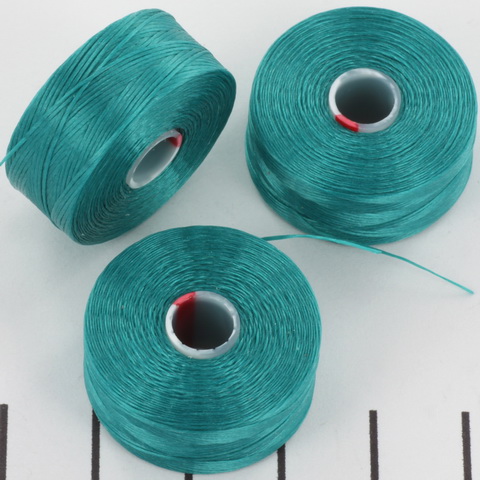Tex is 45, a full bobbin measures 24 X 12 mm and there is approximately 78 yards (71 meter) per bobbin. This thread will fit through size 15/0 seed beads or larger. C-lon thread is synthetic. This thread is almost identical to Nymo thread size D, which is no longer produced.