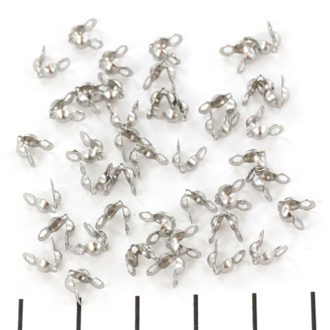 A calot is used to neatly finish steel wire or nylon thread to nicely hide the knot or crimp bead. It is important that the knot you attach is very sturdy and secured with a drop of glue. You have to cut the ends against the knot very short. These calots are very small and that gives you a very subtle finish. This also means that the crimp bead or knot that you want to hide must be very small. Actually not bigger than 1 mm.