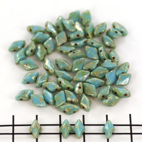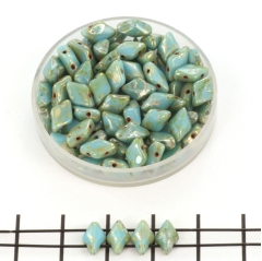 The Gemduo is a Czech glass bead. It is 5 mm in width and 8 mm in height with a thickness of 3.5 mm. This diamond shaped bead has 2 holes. the unique shape with straight lines makes the beads allign well with eachother.