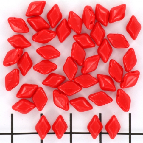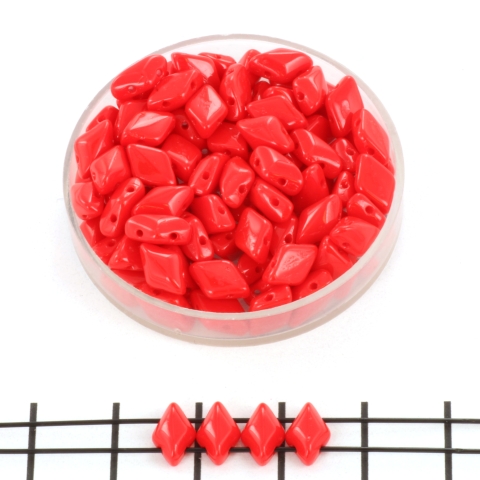 The Gemduo is a Czech glass bead. It is 5 mm in width and 8 mm in height with a thickness of 3.5 mm. This diamond shaped bead has 2 holes. the unique shape with straight lines makes the beads allign well with eachother.
