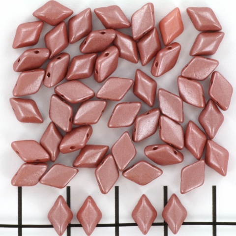 The Gemduo is a Czech glass bead. It is 5 mm in width and 8 mm in height with a thickness of 3.5 mm. This diamond shaped bead has 2 holes. the unique shape with straight lines makes the beads allign well with eachother.