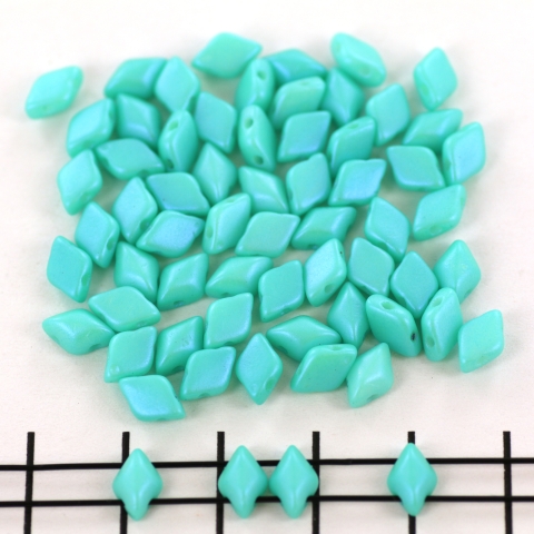 The Gemduo is a Czech glass bead. It is 5 mm in width and 8 mm in height with a thickness of 3.5 mm. This diamond shaped bead has 2 holes. the unique shape with straight lines makes the beads allign well with eachother.