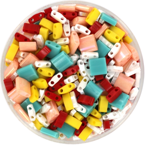 The mixes with tila beads consist of whole, half and quarter tila beads, which can be used together in a piece of jewelry. The whole tilas are 5 x 5 mm, the half tilas are 2.5 x 5 mm and the quarter tilas are 1.25 x 5 mm. This means that the width of the different tila beads is always exactly 5 mm of all of them.