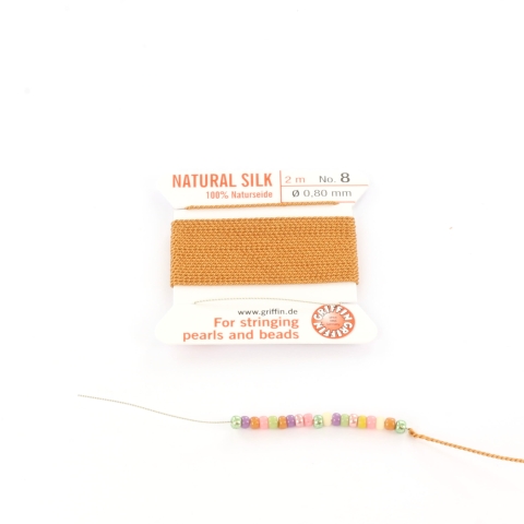 Griffin 100% natural silk thread no. 8. The card contains 2 meters of silk thread of 0.80 mm thickness, with a handy needle on the thread.
