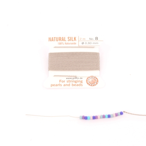 Griffin 100% natural silk thread no. 8. The card contains 2 meters of silk thread of 0.80 mm thickness, with a handy needle on the thread.