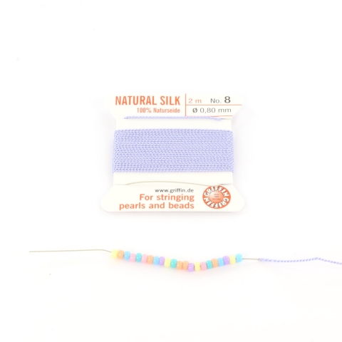 Griffin 100% natural silk thread no. 8. The card contains 2 meters of silk thread of 0.80 mm thickness, with a handy needle on the thread.